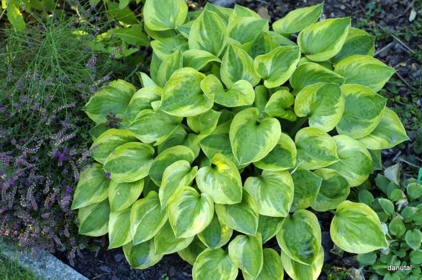 Rozmiar: S/M wysokość 25-30cm. Liście: grube,sercowate z zielonym centrum i żółtym, nieregularnym marginesem Kwiaty:lawendowe na wysokich 60 cm łodygach /VI-VII/ Zalecane stanowisko: od słonecznego do cienistego Uwagi: