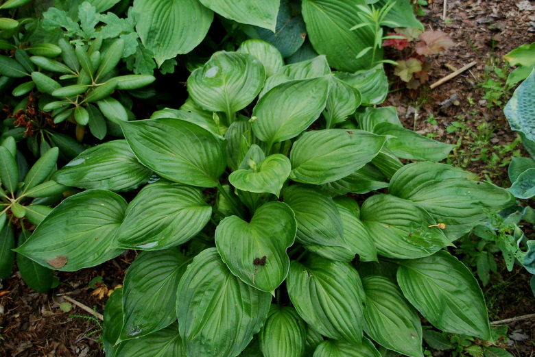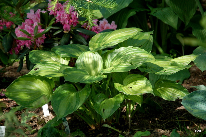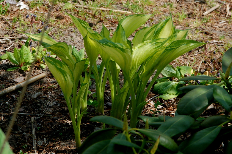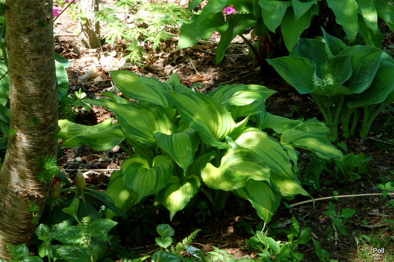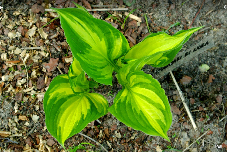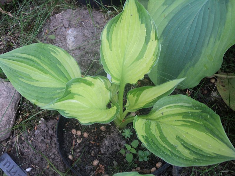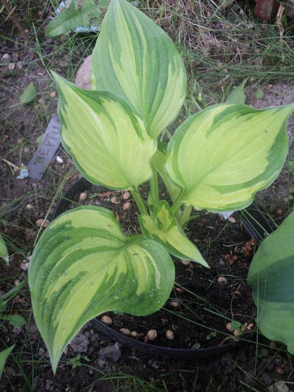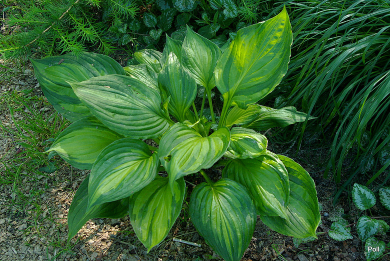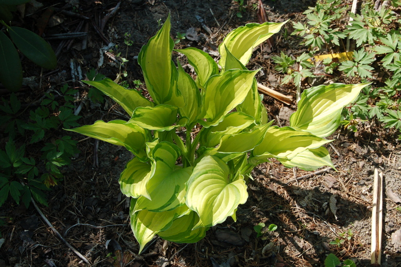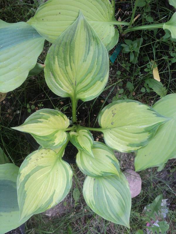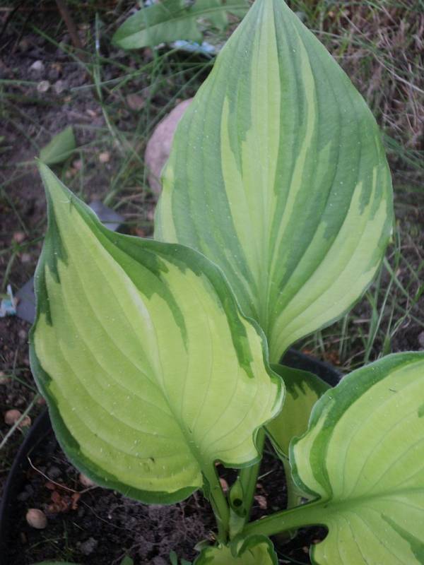 ventricosa Aureomaculata. Wiosną jest bardzo jaskrawa- mocno żółte centrum otoczone jest żywozielonym marginesem. Powierzchnia liścia lśni, odbijając promienie słoneczne, co jeszcze potęguje wrażenie jaskrawości. Wraz z upływem sezonu liście ciemnieją, stają się coraz bardziej zielone. Bardzo ciekawa hosta, ale chyba głownie dla ogrodów kolekcjonerskich