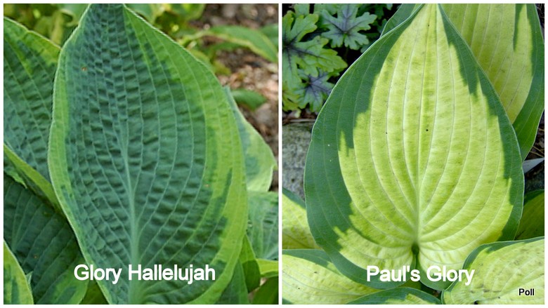 Liście: duże, okragło-sercowate, grube, wyraźnie burchlaste; wiosną niebieskie z zielonkawym marginesem, w trakcie sezonu zmieniają barwę na ciemną-stają się niebieskozielone a margines jaśnieje i staje się jaskrawo złocisty