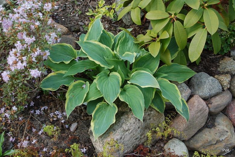 Rozmiar: M wysokość od 35 do 45 cm, szerokość 80-90 cm Liście: szaro-zielone liście o kremowo-białej krawędzi, 18x13 cm Kwiaty: jasno lawendowe, kwitnie od połowy czerwca do połowy lipca Zalecane stanowisko: półcień do cienia Uwagi: