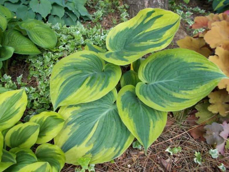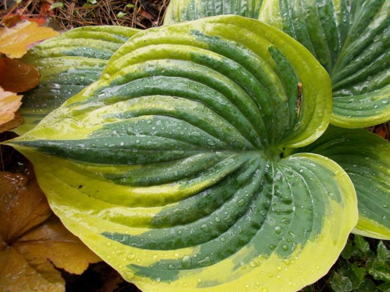 Liście: sercowatego kształtu, o dobrej substancji i mocno odznaczających sie nerwachi, z połyskiem; zielone centrum otoczone jest bardzo szerokim, nieregularnym, kremowym marginesem - wiosną margines jest żółty