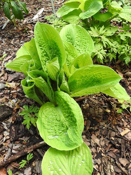 Rozmiar M wysokość 45-50cm Liście prawie okrągłe, wiosną jasno-żółte, zielenieją w ciągu sezonu. Kwiaty blado lawendowe /VI-VII/ i prawie okrągłych liściach. Zalecane stanowisko: półcieniste /toleruje większe nasłonecznienie/