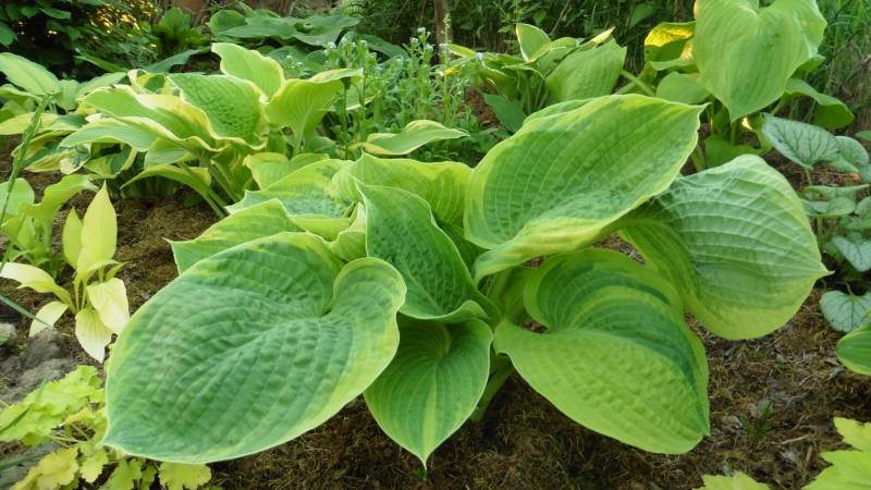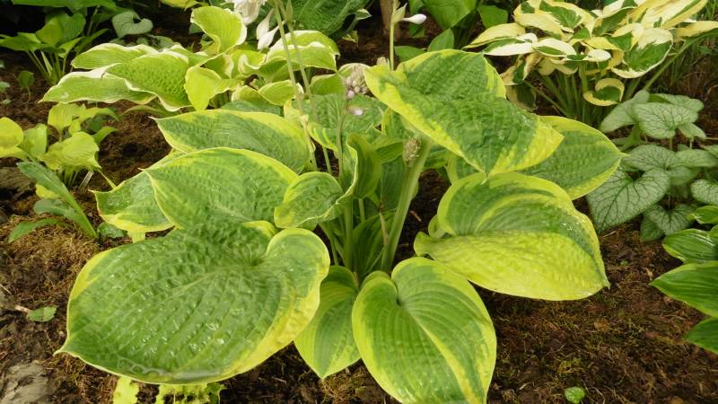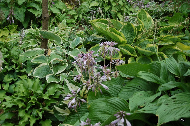 'Laura and Darrell' otoczeniu innych host, na dość suchym, półcienistym stanowisku