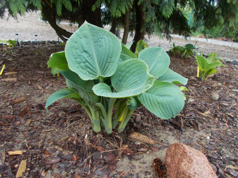 Wielkość: 80 -90 cm Liście: grube i lekko faliste , wiosną niebieskie i pokryte pudrem , później błyszczące z metalicznym połyskiem Kwiaty:- jasno lawendowe Wzrost: średni Stanowisko: cień , półcień