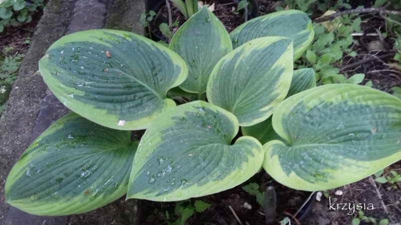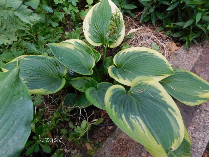 Rozmiar:L (wysokość około 60-65 cm) Liście: duże, karbowane, o zielononiebieskim środku i szerokim, złotym marginesem, Kwiaty: blado lawendowe pojawiają się w połowie lata (czerwiec/lipiec) Zalecane stanowisko: pół cieniste, cieniste