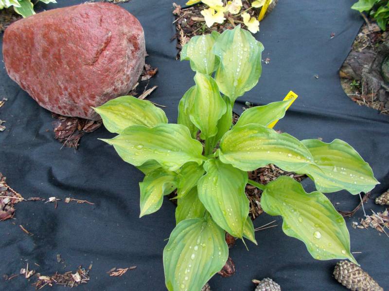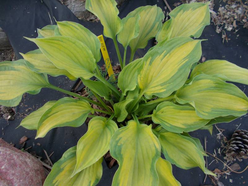 Wielkość - wysokość 60-65 cm Liście - żółte z szerokim zielonym marginesem , lekko falujące Kwiaty - jasno lawendowe Wzrost - średni Stanowisko - cień , półcień