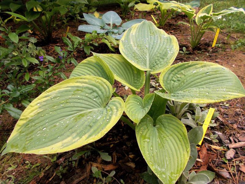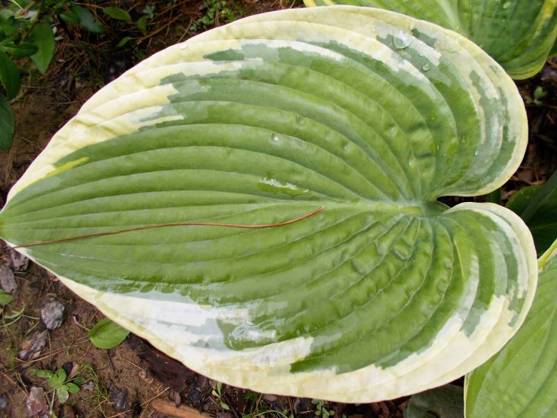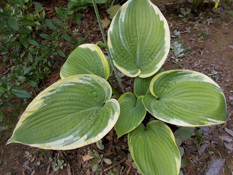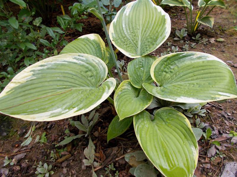 Rozmiar - L (wysokość 60 -70 cm ) Liście - - duże ,zielone , mocno pofałdowane , dobrej substancji , wiosną z żółtym marginesem , później kremowo -białym Kwiaty - prawie białe Stanowisko - cień , półcień Wzrost - średni