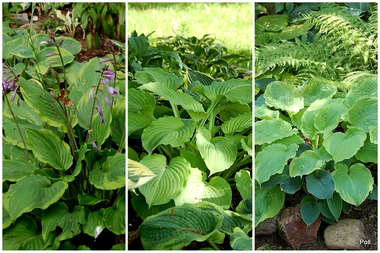 Squash Casserole,to jedna z moich starszych host, co najmniej 10-latka. Przenoszona kilka razy,nieraz na skrajnie suche miejsca,dzielona...zawsze uparcie wybijała coraz większą ilością kłów. Hosta bezproblemowa ładnym, żóltolimonkowym kolorze i charakterystycznym kształcie liści, który przekazała znanym nam sportom np 'Key Lime Pie', czy 'Wave Runner'. Kolaż przedstawia wszystkie trzy hosty, Squash Casserole w środku
