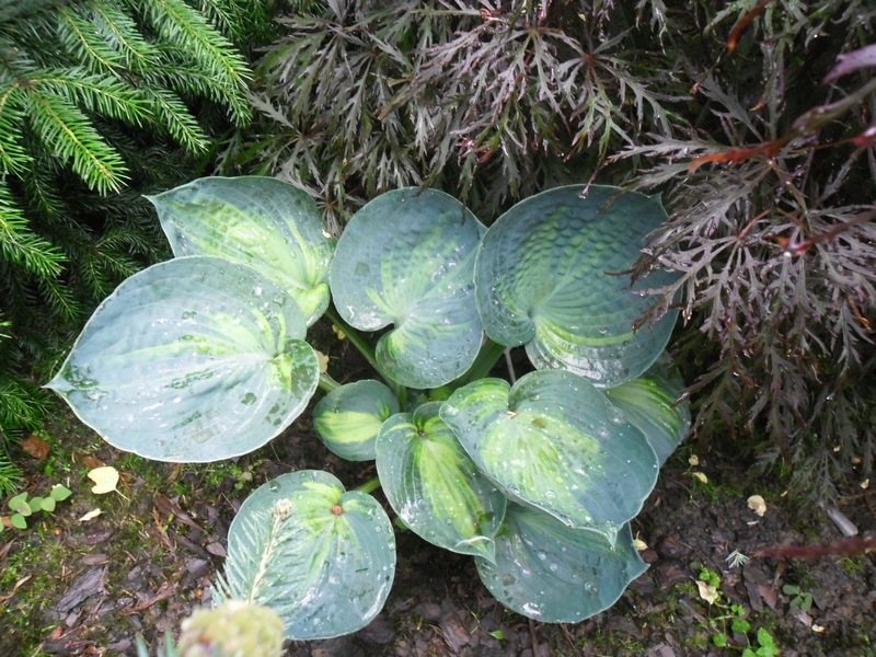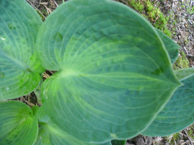Liście burchlaste, masywne, ciężkie, osadzone na krótkich łodyżkach. Środek liścia seledynowy z szerokim sinoniebieskim, pudrowanym marginesem.