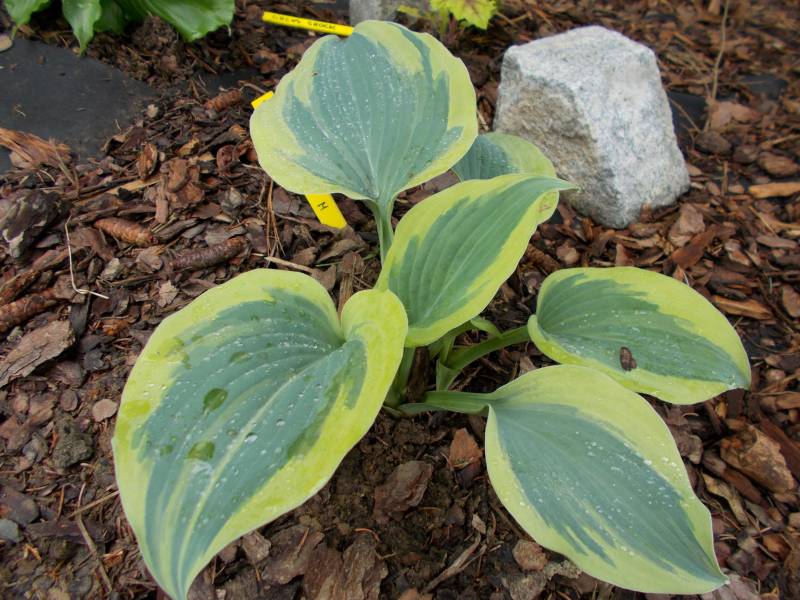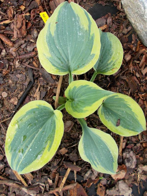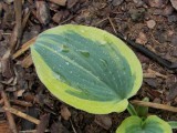 Rozmiar M ( wysokość 35-40 cm ) Liście - sercowate , grube z niebieskim centrum i żółto kremowym marginesem Kwiaty - lawendowe Wzrost - średni Stanowisko - cień , półcień