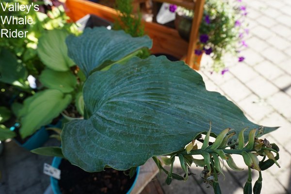 Rozmiar L wedle danych rejestracyjnych ma osiągać około 80 cm wysokości przy 80 cm szerokości Liście: duże, sercowate, lekko skręcone ze spiczastym wierzchołkiem, o wymiarach około 44 x 25 cm... niebieskie z pofalowanym marginesem... matowe, dobrej substancji Kwiaty: niemal białe (VIII/IX) na 100 cm łodygach Zalecane stanowisko: pólcień/cień