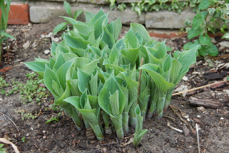 Rozmiar M wysokość 35-40 cm Liście: sercowate.. niebieskie z początkowo zielonkawo żółtym, następnie żółtym marginesem... dobrej substancji Kwiaty: lawendowe (VII/VIII) Zalecane stanowisko: pólcień/cień