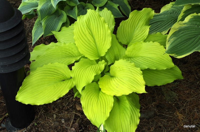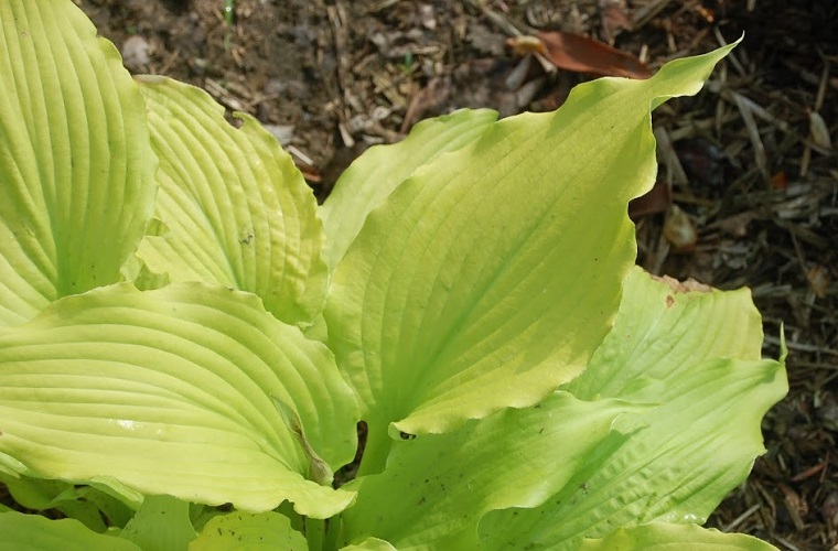 Liście: duże, mocno unerwione, z pofalowanym brzegiem; wiosną bardzo jaskrawe żółto-kremowe, w sezonie minimalnie zielenieją;