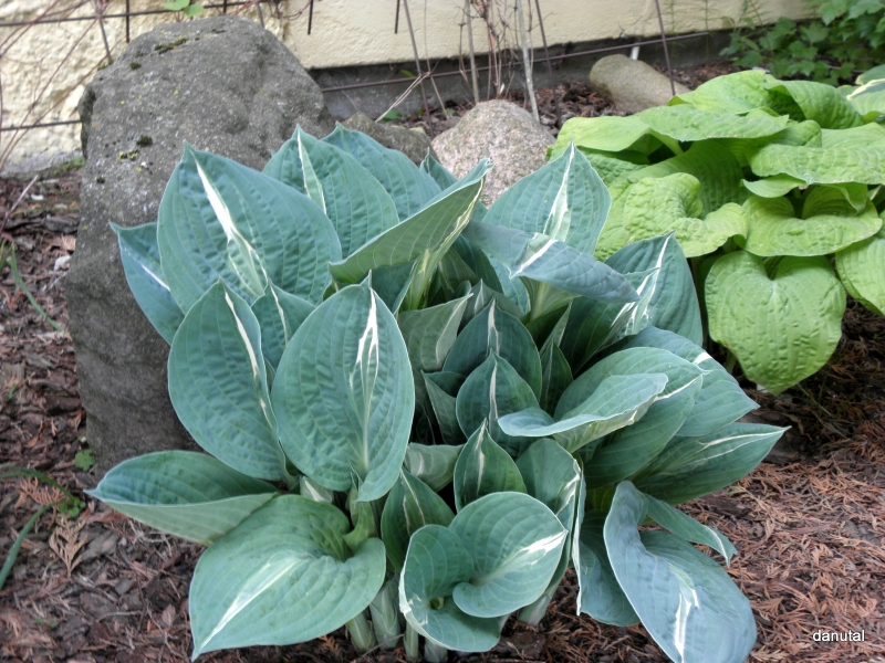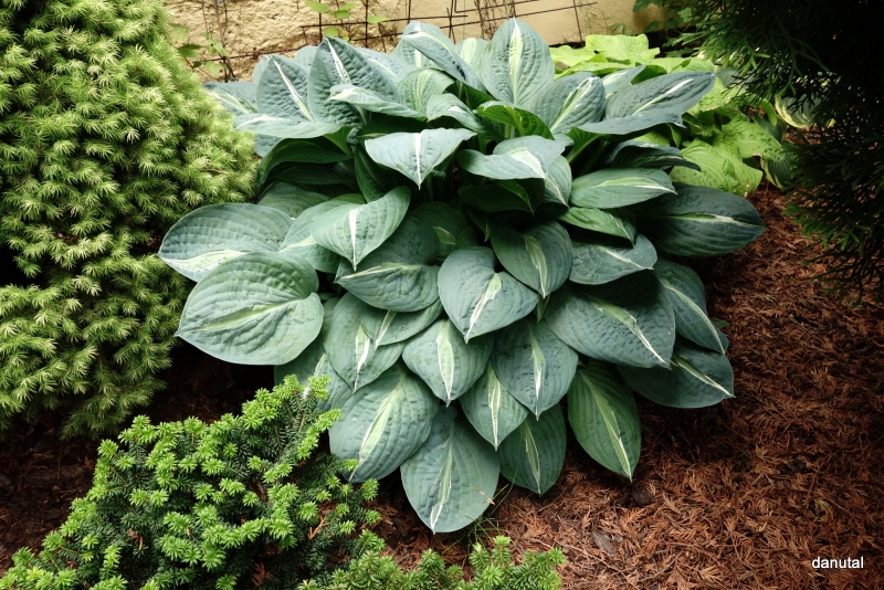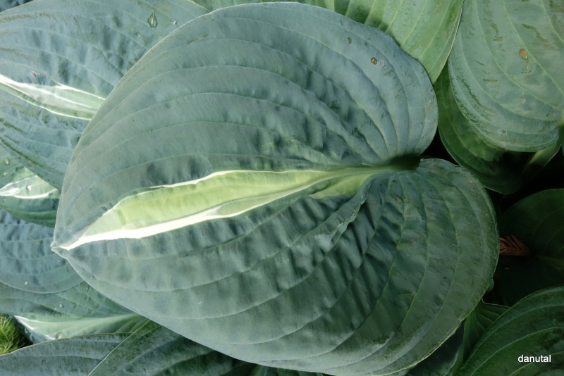 Liście: dobrej substancji,niebiesko-zielone z żółtym centrum oddzielonym od marginesu śnieżno białą "nitką" ;centrum liścia początkowo zielonkawe pod koniec sezonu staje się złoto-żółte.