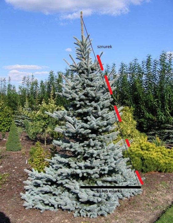 Nie wiem, czy u Ciebie znajdzie to zastosowanie, ale gdy tnę "reprezentacyjny" świerk przed wejściem do domu, to robię to tak, że wiążę sznurek na czubku i ciągnę go do ziemi (cienka czarna linia), odmierzam odległość od pnia jakimś kijem lub miarką (gruba czarna linia), wiążę koniec sznurka na końcu tej miarki.