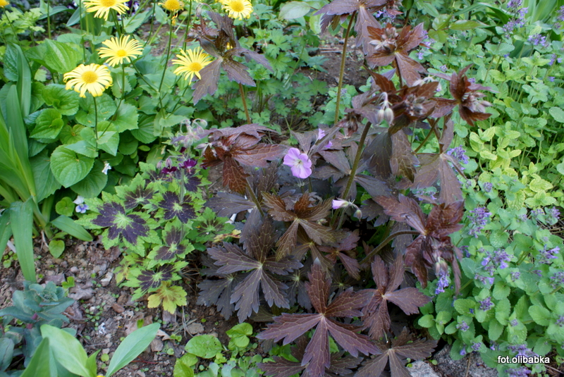 Liście : ciemne, brązowe, charakterystyczne dla bodziszków plamistych. Warte odnotowania piękne przebarwienia jesienne.