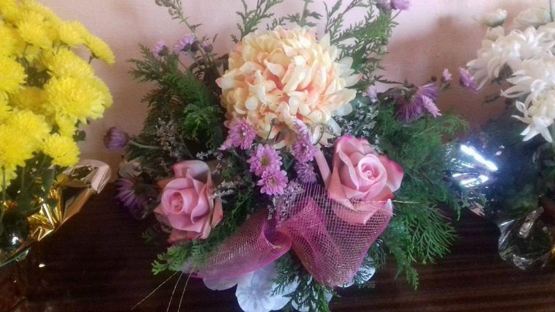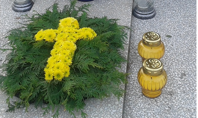 U nas kwiatami na grobowiec zajmuje się moja mama, która ma dar florystyczny. Niestety, szukam i szukam i zdjęć nie ma. Jedno tylko z ubiegłego roku. Również u nas nie ma typowych cmentarnych wiązanek.
