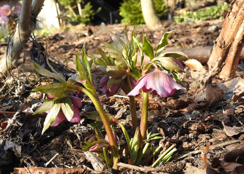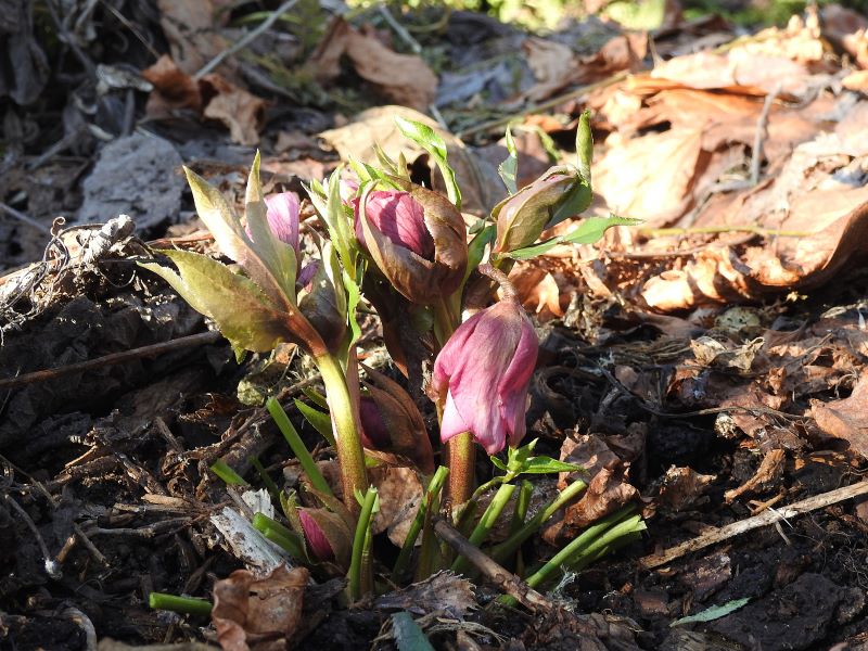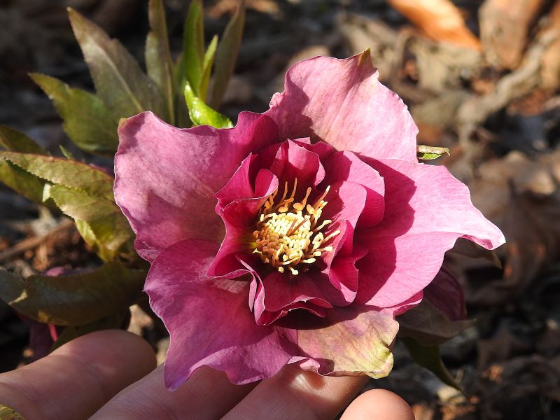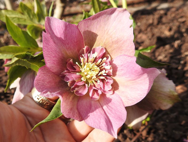 Krócej i mniej poetycko pisząc, kwiaty ViV 'Teresa' należą do typu kwiatów anemonowych, których kryza tworzona jest w wyniku rozrośnięcia się miodników. Wokół centrum ułożone są w dwóch rzędach różowe płatki z ciemniejszymi kropeczkami. Średnica pojedynczego kwiatu wynosi około 6 cm. Liście są typowe dla ciemierników ogrodowych - palczaste i żywo zielone. Ze względów zdrowotnych i estetycznych zaleca się ich usuwanie, gdy pąki są już dobrze widoczne nad gruntem. Choć inne ciemierniki z serii ViV rozpoczynają kwitnienie nawet w sierpniu, to w moim ogrodzie pąki 'Teresy' pojawiają się dopiero na początku stycznia a kwitnąć zaczyna na przełomie stycznia i lutego.