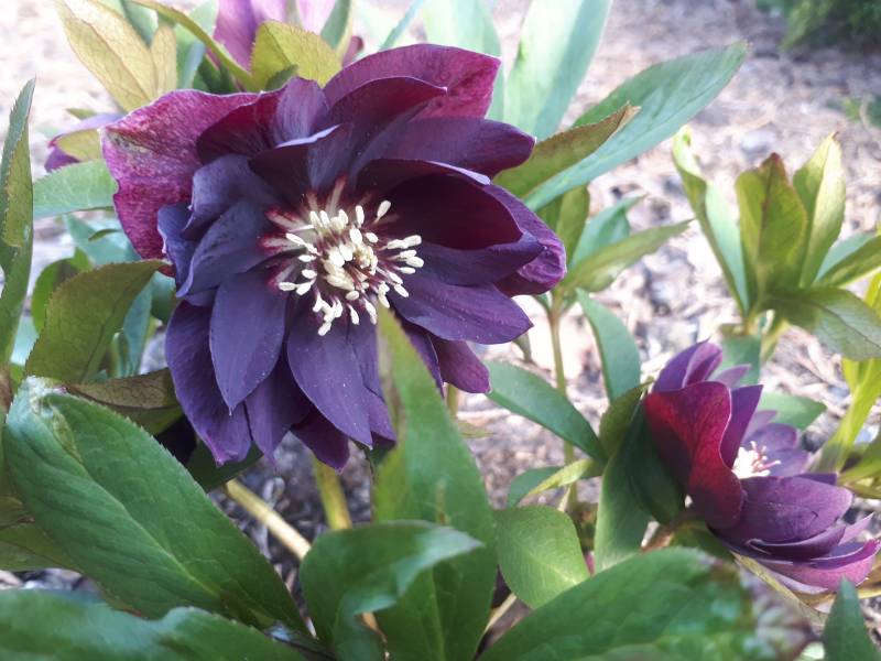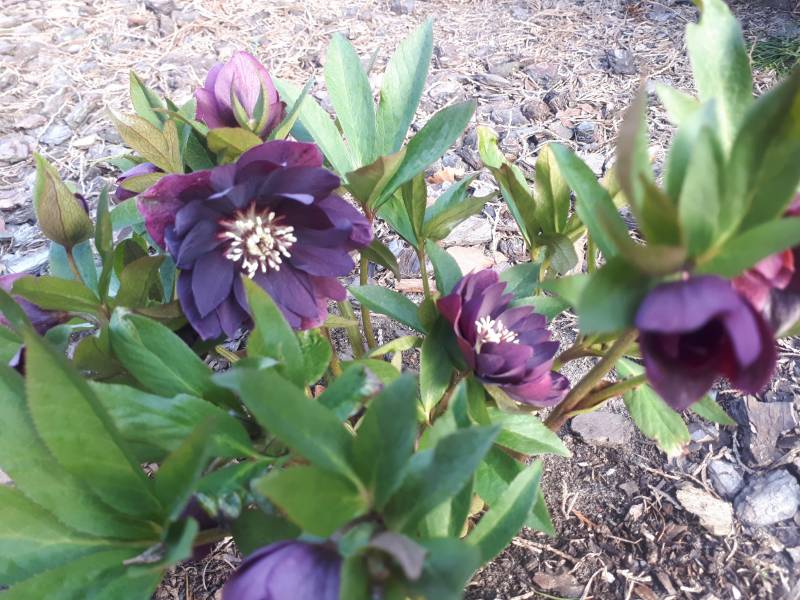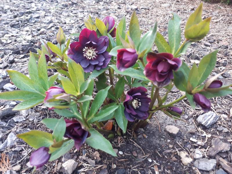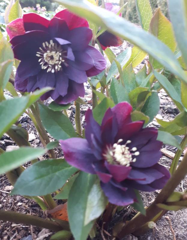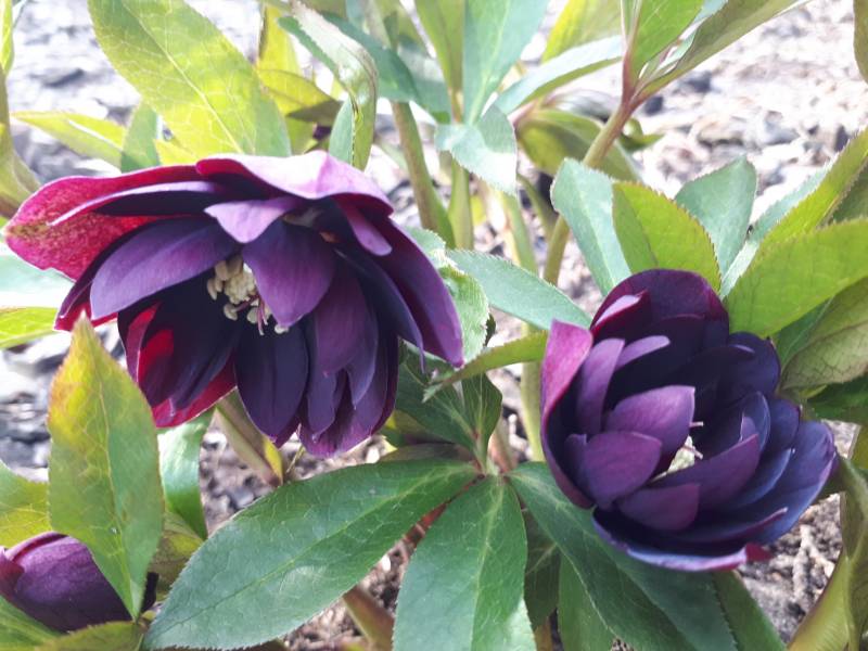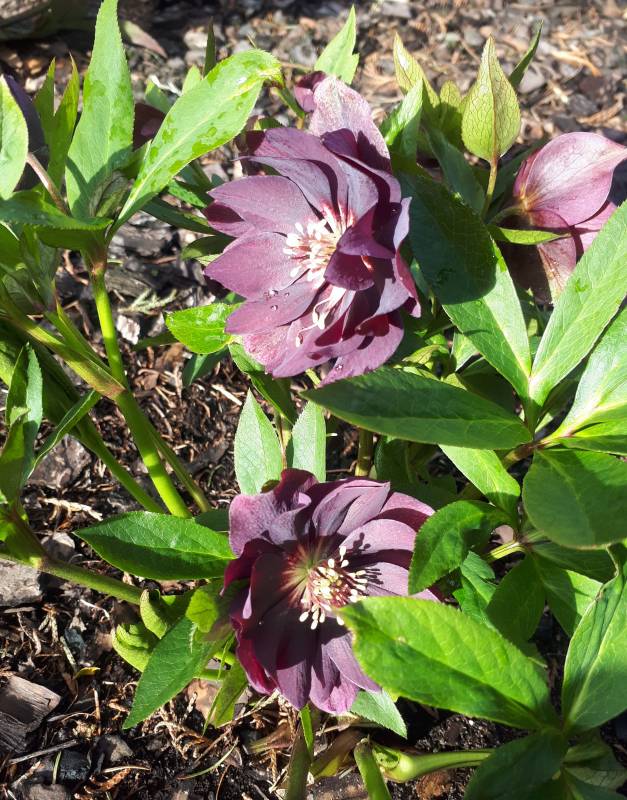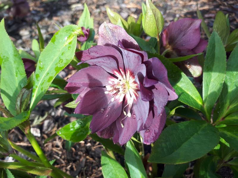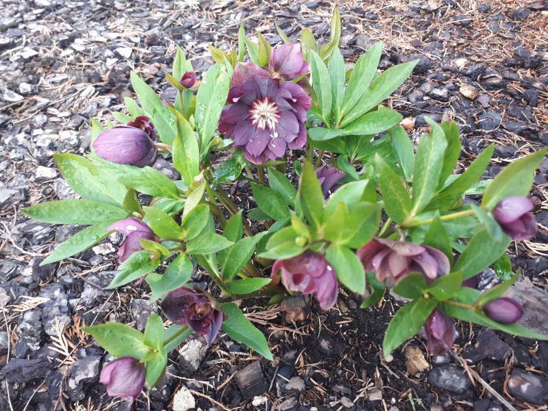 Drugi egzemplarz Helleborus x hybridus 'ViV Luisa' rośnie na w pełni słonecznym stanowisku i tu widać szybszy postęp- pojedyncze kwiaty już się rozwinęły.