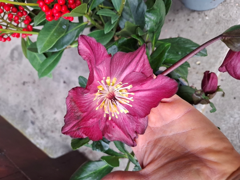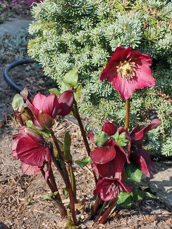 i więcej. Ich barwa to nasycona, ciemna czerwień wpadająca w odcienie wina lub dojrzałej wiśni. W pełnym słońcu kolor staje się bardziej soczysty i nabiera nut magenty, natomiast w cieniu dominuje elegancki, mroczny burgund. Kwiaty zbudowane są z 5 płatków, ułożonych w pojedynczym okółku. Osadzone na mocnych, wyprostowanych łodygach, są przeważnie skierowane na zewnątrz. Zimozielone liście są ciemnozielone z jaśniejszym zielonym unerwieniem, umiarkowanie błyszczące, skórzaste i twarde, o charakterystycznie piłkowanych brzegach. Opisywana jest jako roślina o średniej sile wzrostu i wedle patentu ma osiągać kompaktowe rozmiary: