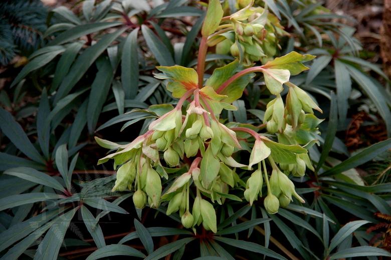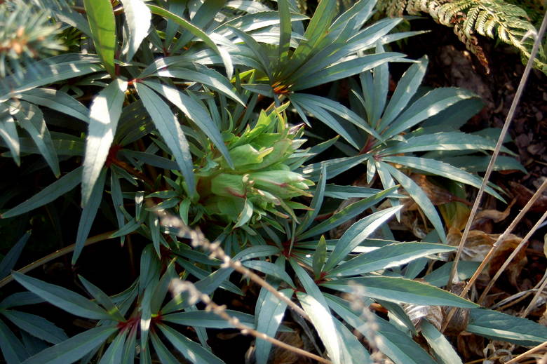 Ciemiernik cuchnący (Helleborus foetidus) 'Harvington Pewter' pokazuje już łodygi z pąkami kwiatowymi. Zapewne, kwiaty rozwiną się w pełni na przedwiośniu, może w marcu?