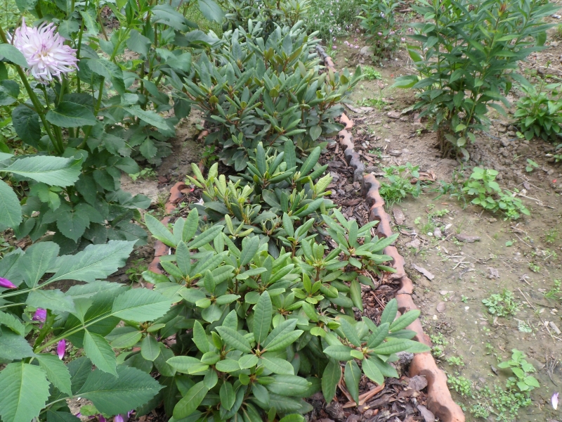 Moje rododendrony w tym roku zrzuciły sporo liści. Przyczyna jest prosta. Liście zrzucone, to liście zeszłoroczne. A zeszły rok, zwłaszcza lato były dla rodków straszne. Niesamowity upał i suchość powietrza (zwłaszcza powietrza, bo rodki podlewałam regularnie)sprawiły, że rośliny ledwie zipiały. Tak też z ulgą teraz zrzucają te liście, które ledwie mogły utrzymać. Taka jest moja obserwacja z wieloletnich upraw rodków zwłaszcza tych po przejściach. A w zasadzie to oprócz dwóch, wszystkie właśnie pochodzą z różnych ogrodów, gdzie coś im nie pasowało.