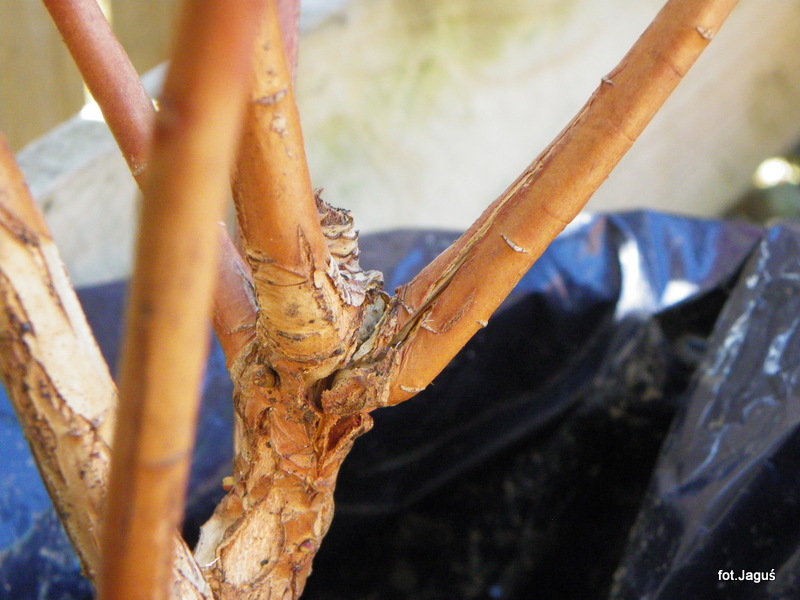I jeszcze nadłamana gałązka... krecigl albo ją obetnij i spróbuj zrobić z niej sadzonkę wedle przepisu na forum... albo to miejsce obsyp ukorzeniaczem, dodaj kwaśne podłoże i obwiń czarną folią, śćiślej na dole, lużniej na górze, robiąc odkład powietrzny i jak puści korzenie, to dopiero wtedy odetnij... albo obsyp ukorzeniaczem i spróbuj usztywnić taśmą... nie wiem, jak głębokie to nadłamanie... rokuje na zrośnięcie?
