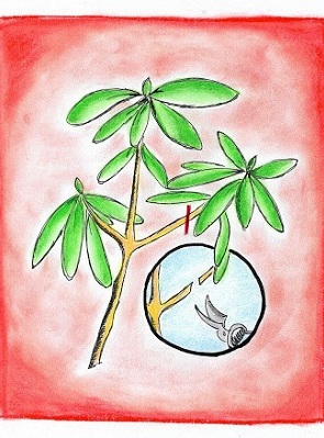 1. Spośród pędów bocznych różanecznika/ azalii wybieramy odpowiedni młody, jednoroczny przyrost z całkowicie rozwiniętymi liśćmi. Ważne, by nie był on ani za miękki, bo zgnije ani za silnie zdrewniały, bo będzie się ukorzeniał bardzo wolno. Następnie odcinamy zeń sadzonkę o długości - w zależności od gatunku - około 7 do 15 cm, u azalii japońskich nawet krótszą. Cięcie wykonujemy tuż pod węzłem, gdyż w tym miejscu pęd jest twardszy i mniej podatny na gnicie, ponadto łatwiej się tu ukorzenia.