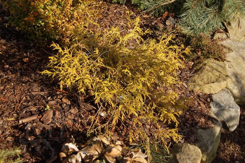 Polu , to z pewnością jest Filifera Aurea .Aurea Nana jest gęsta i nie tak jaskrawa . Filifera Aurea należy do najbardziej delikatnych cyprysików i wiosną wiele gałązek jest do wycięcia , bo są uschnięte . Może to jest susza fizjologiczna , bo jednego mam od wielu lat , rośnie na górze skarpy , gdzie jest sucho , w zimie wieje i jest brzydki . Drugi rośnie w agrotkaninie i kamieniach , wzrost jest dobry jak jego tak i dwóch innych , Aurea Nana i Nana .
