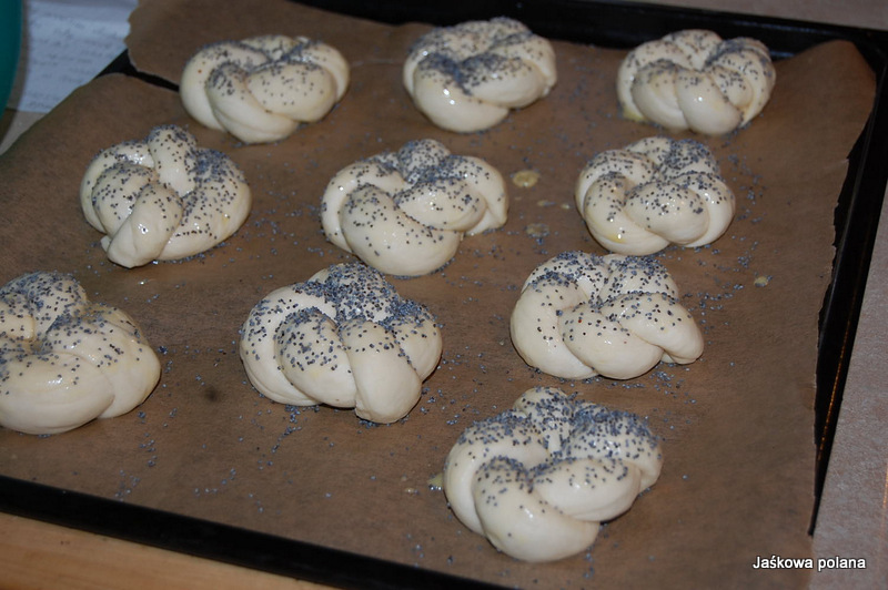 Układamy na blaszce wyłożonej papierem do pieczenia.Smarujemy roztrzepanym jajkiem i posypujemy makiem.Odstawiamy do wyrośnięcia na około 15 minut