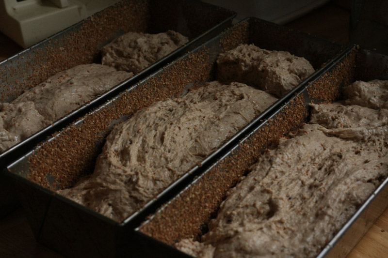 Czekać do wyrośnięcia. Po wyrośnięciu zbijam i tak 3 razy. Keksówki smaruję tłuszczem i wysypuję otrębami. Wkładam ciasto, smaruję z wierzchu rozbełtanym białkiem i posypuję słonecznikiem i prażonym siemieniem lnianym. Jeszcze pozwalam trochę podrosnąć w foremkach i do pieca.