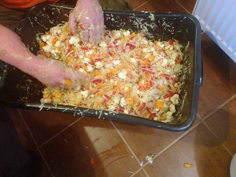 Warzywa gotujemy w łupinach (buraki i ziemniaki lepsze są upieczone, ale to dużo roboty więc taka akcja bardziej świąteczna). Obieramy ze skórki i kroimy w kostkę. Jabłko, ogórek i cebula ( cebulę należy odgazować lub sparzyć, szczypior zostaje taki jaki jest) też tak traktujemy. grzybki kroimy w paseczki, chyba że główki są tak małe że tego nie wymagają. Filety śledziowe też kroimy w paseczki. Kapary odcedzamy i dodajemy do sałatki. Mieszamy wszystkie składniki na końcu dodając ziemniaki i śledzie ( jeżeli mamy szczypior to on albo idzie po śledziach albo ozdabiamy nim gotową sałatkę). Polewamy sosem i czekamy aż się przegryzie.
