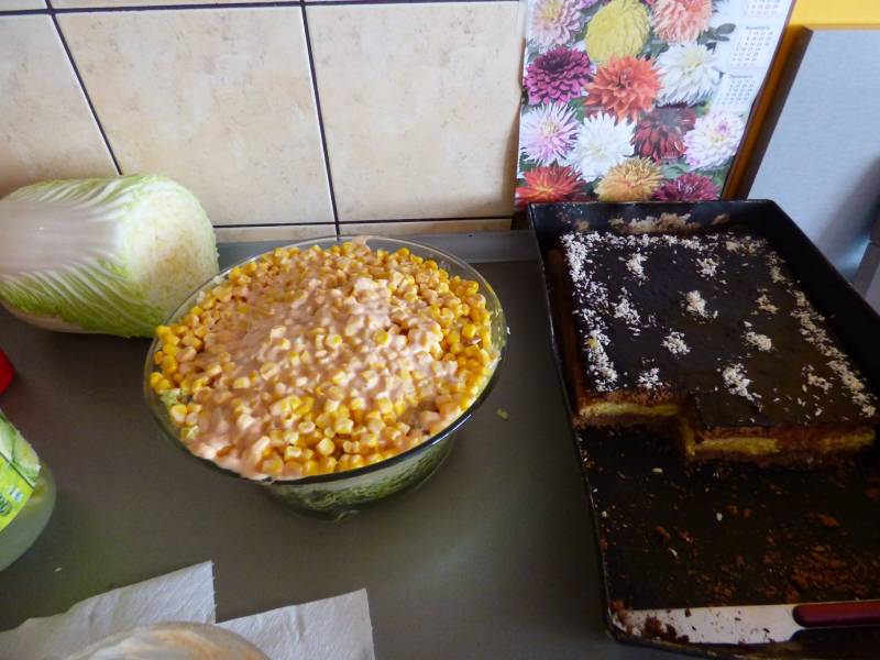 Na to mięso usmażone z kurczaka zimne,sos plus ogórki cebula,kukurydza na wierz trochę sosu i garść kapusty pekińskiej,przykrywamy folią i na 20 minut odstawiamy do lodówki,po tym czasie mieszamy wszystko dokładnie .
