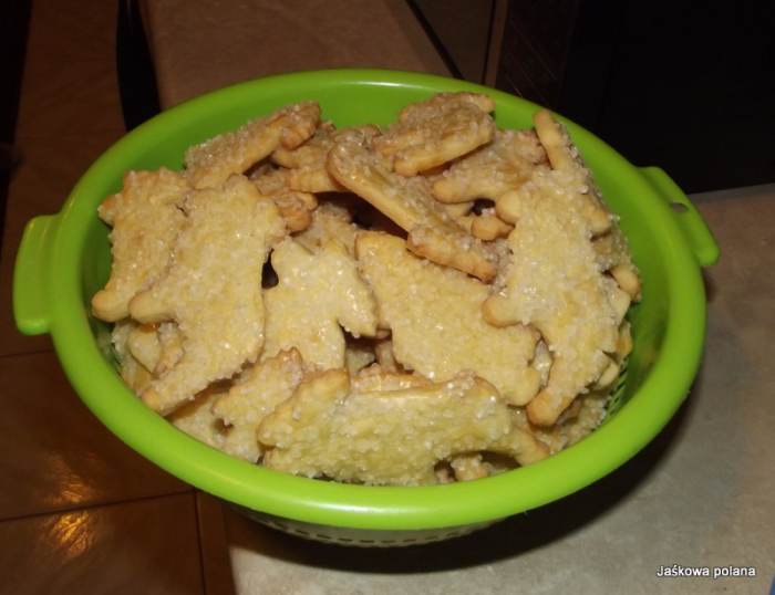 Ciasto rozwałkować na desce, wycinać foremką i piec w temp. 160