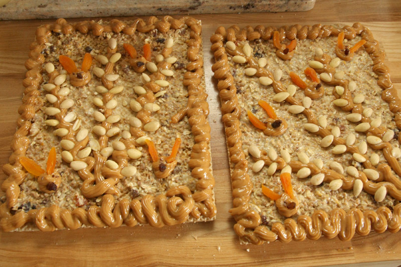 Stroimy kajmakiem przez szpryckę, migdałami, skórką pomarańczową i morelami.