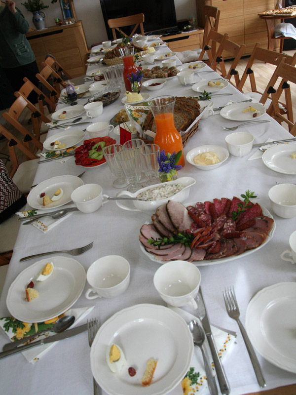 W polskim zwyczaju, po porannej rezurekcji rodzina zasiada do uroczystego śniadania wielkanocnego, które rozpoczyna się składaniem życzeń i dzieleniem się święconką z koszyczka. Na stołach znajdują się jajka, wędliny, wielkanocne baby i mazurki. Stoły zdobione są bukietami z bazi i pierwszych wiosennych kwiatów. W niektórych regionach, np. u nas na Kociewiu rodzice chowali w domu lub w ogrodzie koszyczki ze słodyczami, prezenty od wielkanocnego zajączka, na poszukiwanie których wyruszały dzieci.