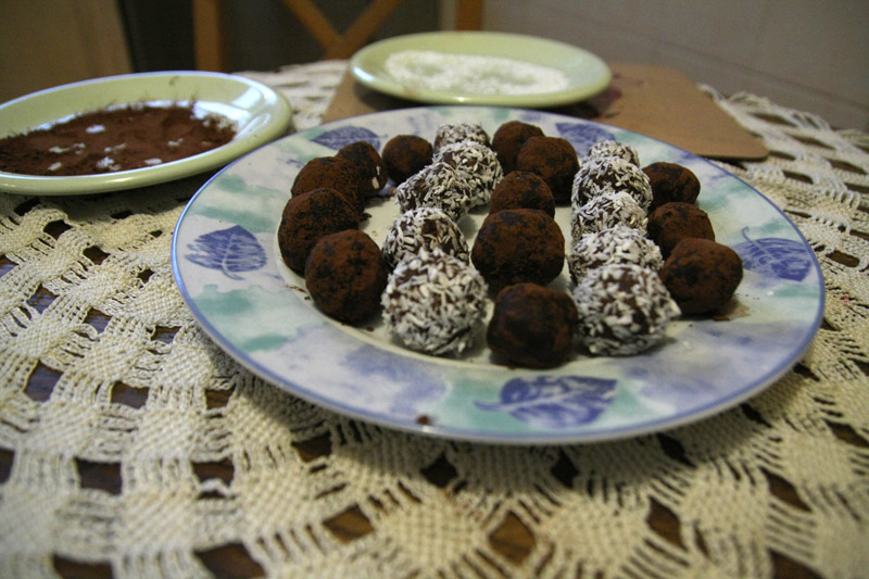 Trudno mówić o proporcjach, ale ja do moich okruchów wsypałam 2 łyżki kakao, wlałam 2,5 łyżki amaretto (może być rum, nalewka wiśniowa lub inny aromatyczny alkohol) oraz ćwierć kostki miękkiego masła. Wszystko ze sobą połączyć i ugnieść. Z tego "ciasta" uformować kuleczki i obtaczać w kakao lub wiórkach kokosowych, schłodzić i jeść!