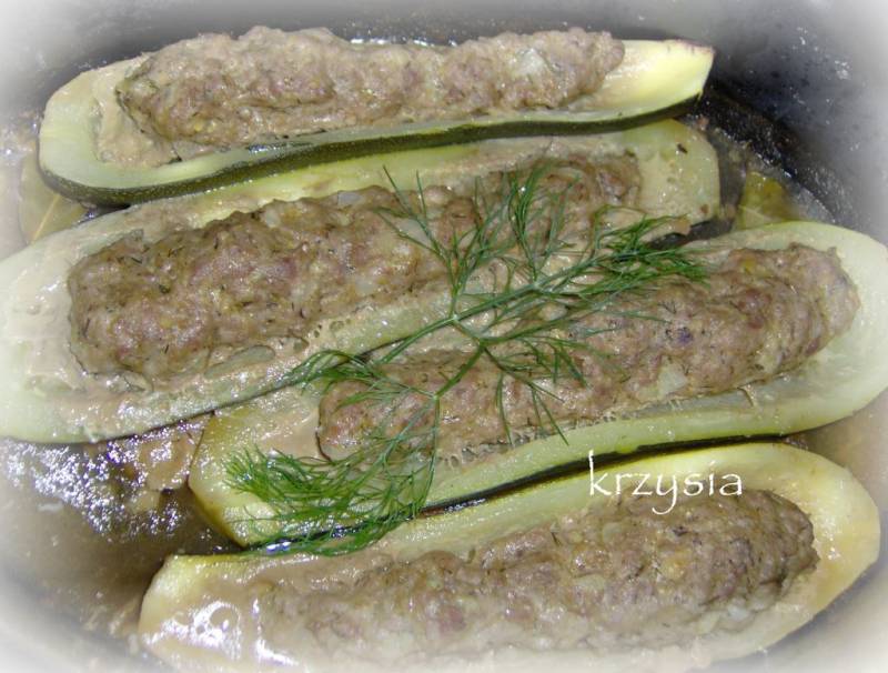 Faszerowane cukinie włożyć do naczynia do zapiekania, podlać odrobiną wody, dodać cebulę, marchewkę, liść laurowy, ziele angielskie i co tak komu pasuje. Świetnie się komponują z sosem pomidorowym lub grzybowym. Przykryć i wstawić do piekarnika, nie wiem na jak długo, bo ja wszystko piekę na oko :diabelek .