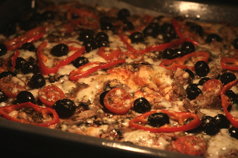Wyrośnięte ciasto rozwałkowuję na blasze, polewam ketchupem lub sosem pomidorowym, układam mozarellę, dodatki, posypuję oregano, skrapiam oliwą i piekę ok 16-18min w temp. 180st.