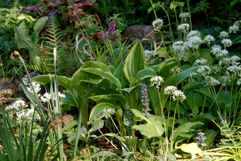 Na zdjęciu hosta Bold Ribbons w chmurze kwiatów czosnku niedźwiedziego.
