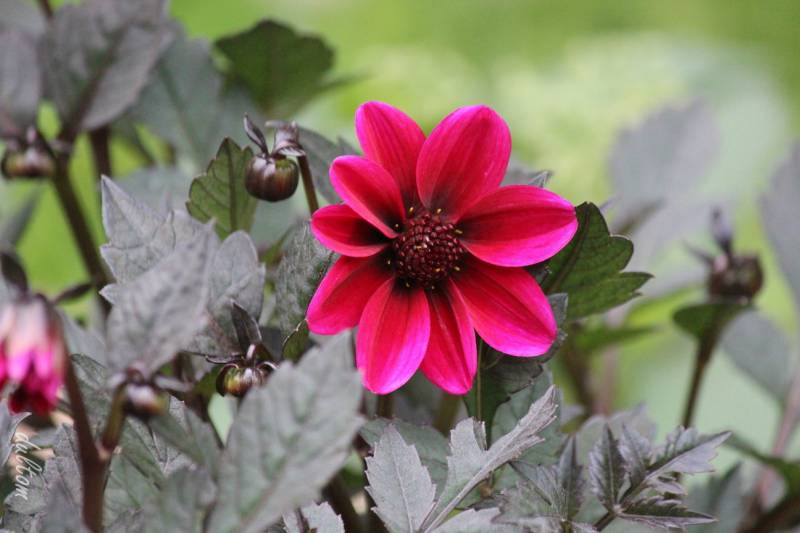 Pierwszy kwiat dalii dekoracyjnej karłowej Gallery Art Nuveau. Trudno go sfocić, bo ukrywa się wśród liści. Mam nadzieję, że następne będą już na szczycie.