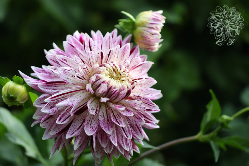 Twórca: nieznany, 2009 Klasyfikacja: pozostałe -chryzantemowa Barwa podstawowa: kremowo- biała Barwa dodatkowa: różowa , fioletowa Wysokość: ok 100 cm Wielkość kwiatu: 20-22cm Uwagi Dość późno zakwita, mimo , że jest niewysoka , wymaga podpór , bo kwiaty po deszczu są ciężkie .