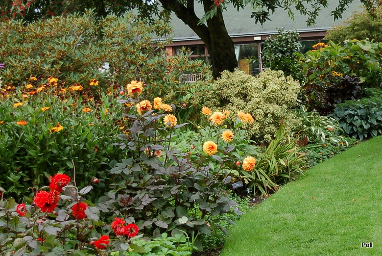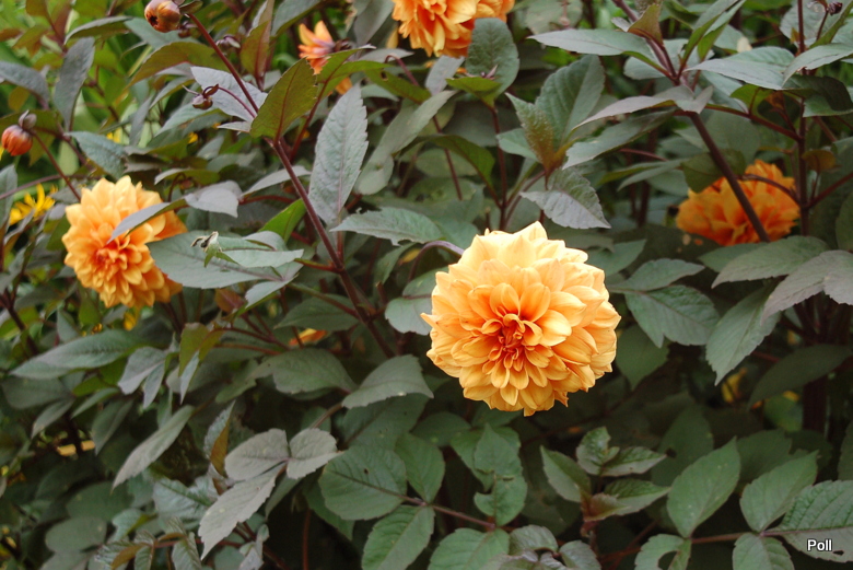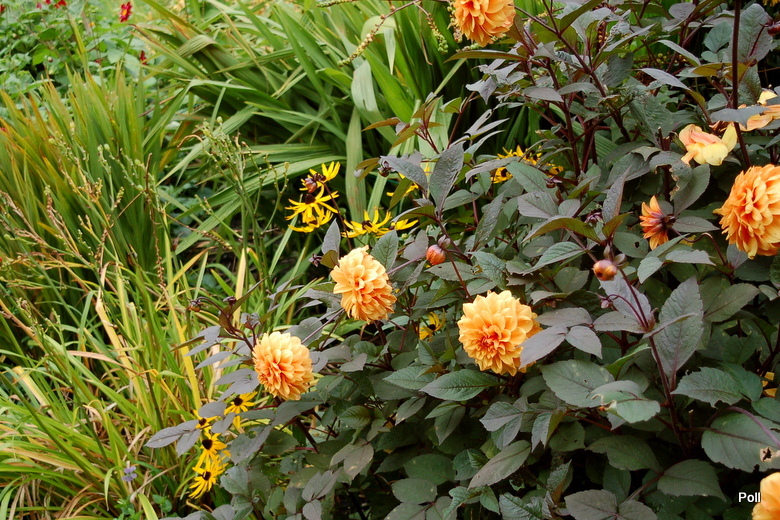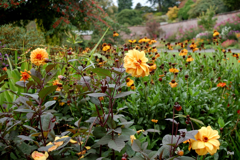 Dalia 'David Howard' w ogrodzie Lakeland Horticultural Society 'Holehird Gardens' (Kumbria). Ciekawa kolorystycznie, bo kwiaty są jasne a liście i łodygi ciemniejsze, niż u innych odmian