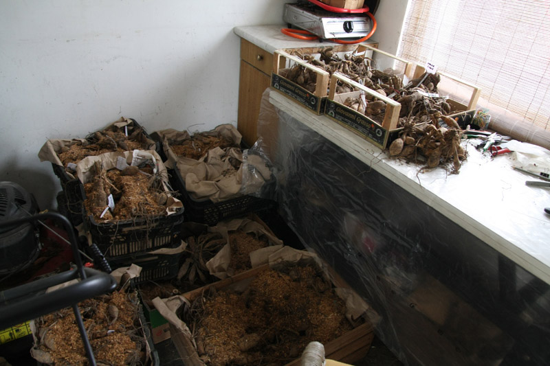 Podzielone dalie przekładam z powrotem do skrzyń, opisane nadmiarowe szykuję do wymian i wysyłek, a te moje czekają cierpliwie w altanie na posadzenie.