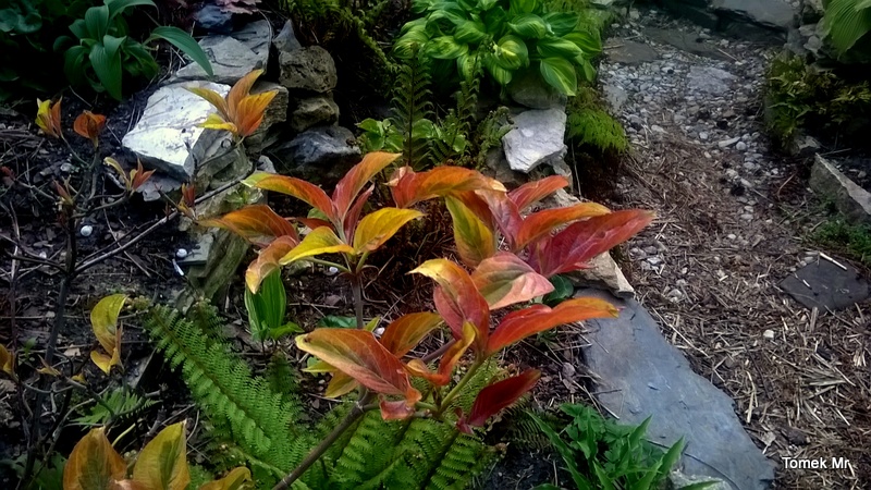 Dereń kwiecisty 'Cherokee Sunset' , mimo dość srogich a bezśnieżnych zim, rośnie, jak na drożdżach. Podczas nawałnicy gradowej w czerwcu, został nieco przechylony i wymagałby podparcia krecigl U mnie, ma za stanowisko miejsce nad oczkiem wodnym, w piaszczystej, ale często podlewanej glebie. Teraz, gdy upały odpuściły, pojawiły się młode liście. Bardzo ładna, dekoracyjna odmiana derenia kwiecistego, długo utrzymująca kolor.