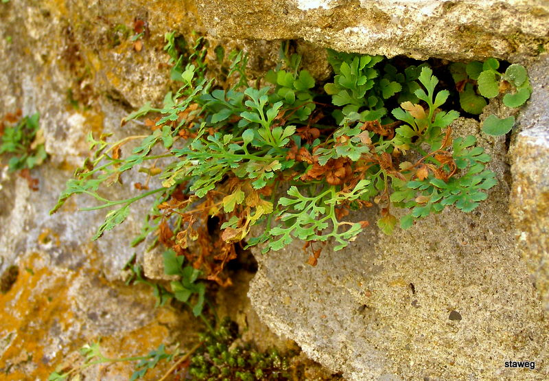 Dokładnie tak, Stachu! Obie te paprocie lubią osiedlać się na starych murach, m.in. zamków, kościołów, czy cmentarzy. Szczególnie pierwsza z nich, zanokcica murowa, ciężka jest do utrzymania w ogrodach, ale pięknie wysiewa się w miejscach, które sama wybierze. Ja od kilku lat zbieram zarodniki w różnych miejscach i wysiewam na swoim ceglanym murze, ale Asplenium ruta- muraria coś się ociąga z jego zasiedleniem. Nadal walczę. :nie_wiem .