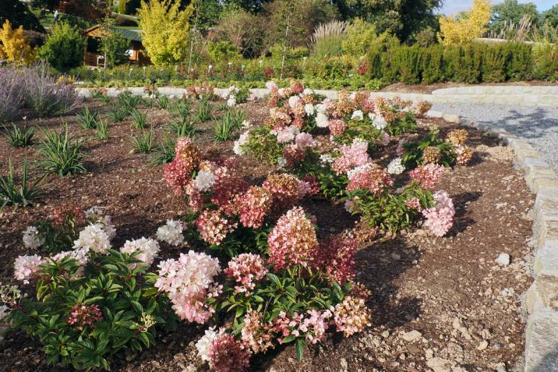 Kwiaty: początkowo czysto białe z czasem różowieją i z upływem sezonu przybierają na intensywności, kwiatostany rozwijają się nierównomiernie, dzięki czemu na jednej kępie podziwiać można niesamowitą rewię barw