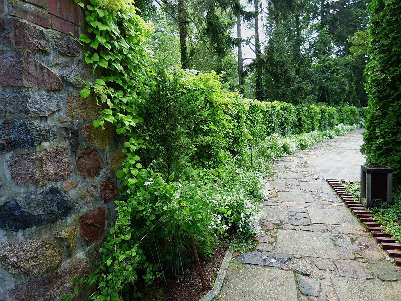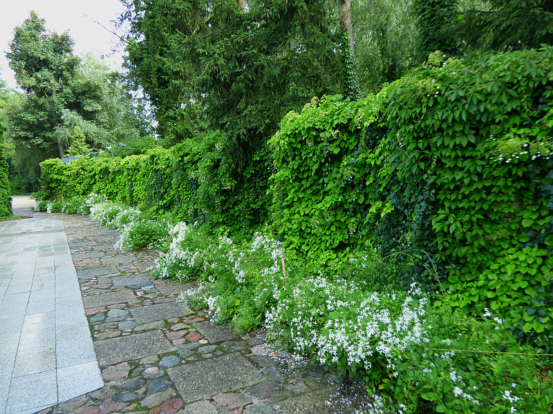 Hortensja pnąca w kompozycji z bluszczem i powojnikiem mandżurskim w arboretum w Żelazowej Woli... zdjęcia z 18.07.2018