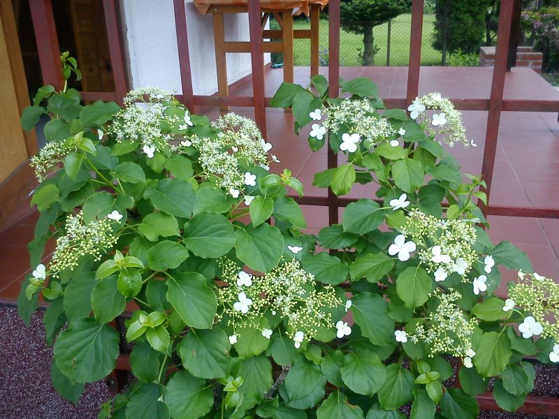 Kwiaty: zebrane w płaskie kwiatostany o średnicy od 15 do 25 cm... złożone z dwóch rodzajów kwiatów: większe, białe kwiaty płone otaczają jego brzegi, natomiast drobniejsze, zielonkawobiałe kwiaty płodne wypełniają jego wnętrze... kwitnie od czerwca do końca lipca... warto jednak wiedzieć, że pierwsze pąki kwiatowe na tej hortensji pojawiają się dopiero po 4-5 latach od jej posadzenia