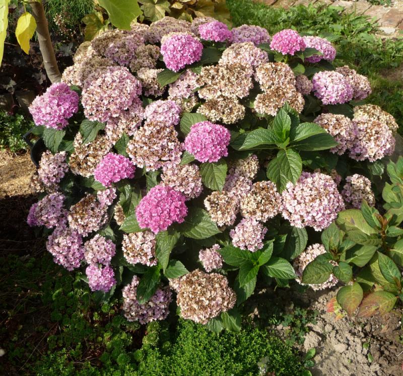'Expression' kwitnie zarówno na dwuletnich jak i tegorocznych pędach, więc nawet jak podmarznie, to i tak będą kwiaty, trochę mniej ale będą. A tak poza tym to normalna ogrodówka o pełnych kwiatach. W kwaśnej glebie z dostępnymi jonami glinu można uzyskać kolor niebieski, tak jak w innych różowych ogrodówkach.